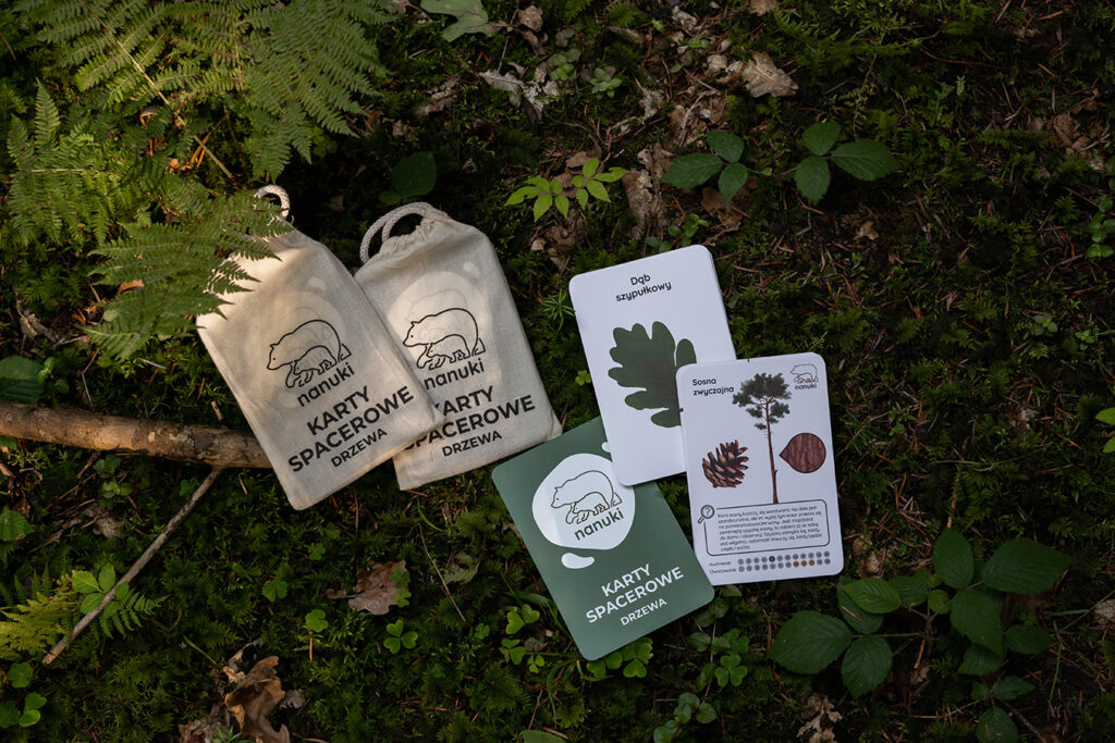 Kolejnym zestawem były Karty Spacerowe NANUKI. Założeniem tego produktu, była nauka przez zabawę, zachęcanie dzieci do spędzania czasu na świeżym powietrzu i zainteresowanie ich światem. Piękne ilustracje cudownie odzwierciedlają drzewa, liście czy szyszki w rzeczywistości, dzięki czemu dzieciom łatwiej jest dopasować odpowiednia kartę do obserwacji. Informacje o danym drzewie dobieraliśmy pod kątem cech charakterystycznych, a także atrakcyjności danej cechy. Chcieliśmy, by dla dzieci było prosto ale również ciekawie. By krótka i treściwa informacja dostarczyła im konkretnych ciekawostek na temat drzew.