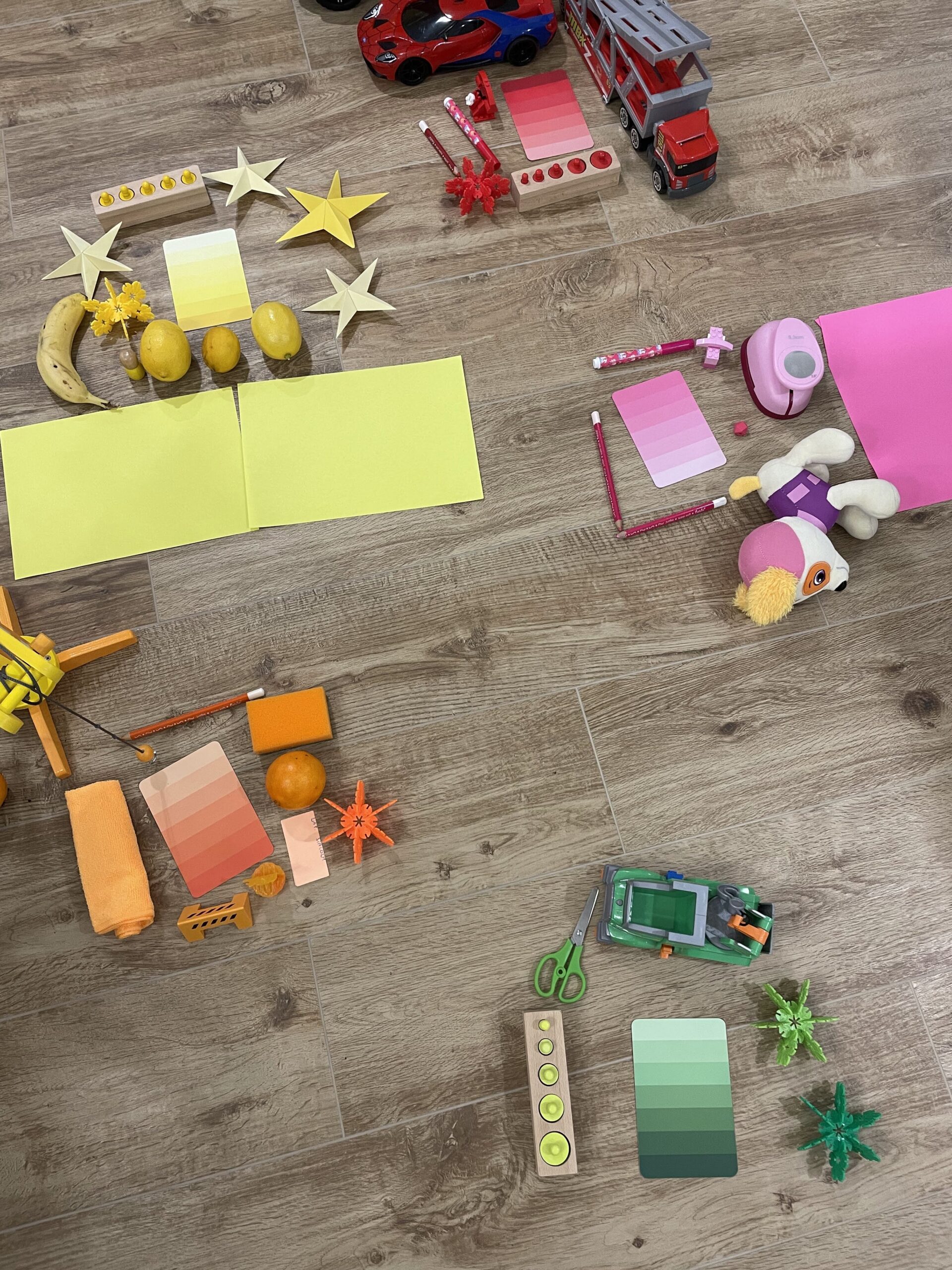 Zestaw składa się z 12 kart z paletą kolorów. Na jednej stronie tych kart znajduje się nazwa koloru oraz kilka przedmiotów w tym kolorze, które możecie znaleźć zarówno w domu jak i na spacerze. Na odwrocie znajdziecie paletę danego koloru składającą się z kilka odcieni. Staraliśmy się barwy oddzielić, a także nie przesadzać z ich ilością. Wszystko po to, aby dziecku łatwo było samodzielnie korzystać z kart, a także łatwo zidentyfikować konkretną barwę.