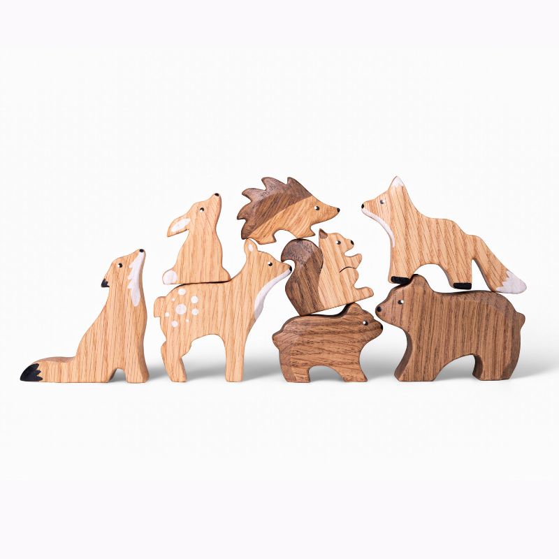 W środku czeka osiem figurek: niedźwiedzica, niedźwiadek, lis, wilk, sarna, jeż, zajączek i wiewiórka. Każda ma wielkość dopasowaną do małych dłoni (4–10 cm), a dzięki naturalnej fakturze drewna i ręcznemu malowaniu zachwyca niepowtarzalnym wyglądem.