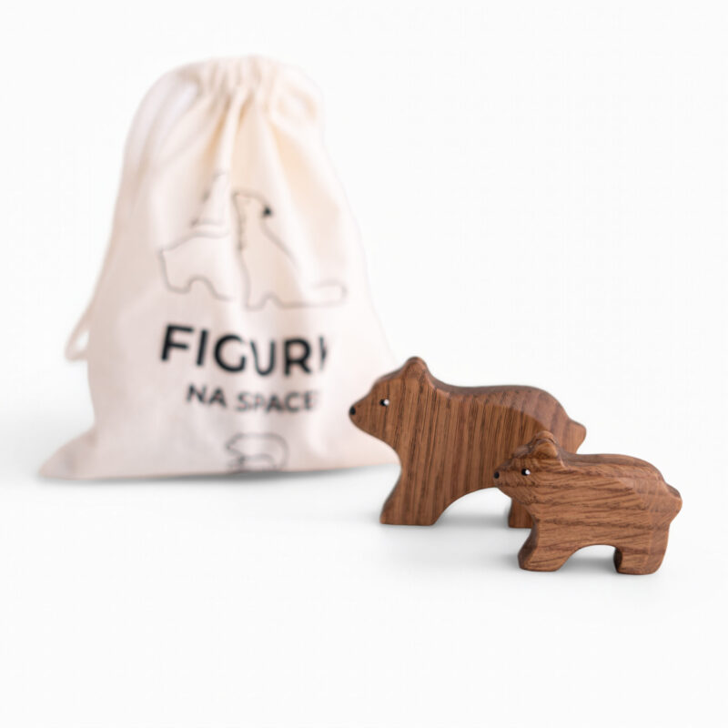 W środku czeka osiem figurek: niedźwiedzica, niedźwiadek, lis, wilk, sarna, jeż, zajączek i wiewiórka. Każda ma wielkość dopasowaną do małych dłoni (4–10 cm), a dzięki naturalnej fakturze drewna i ręcznemu malowaniu zachwyca niepowtarzalnym wyglądem.