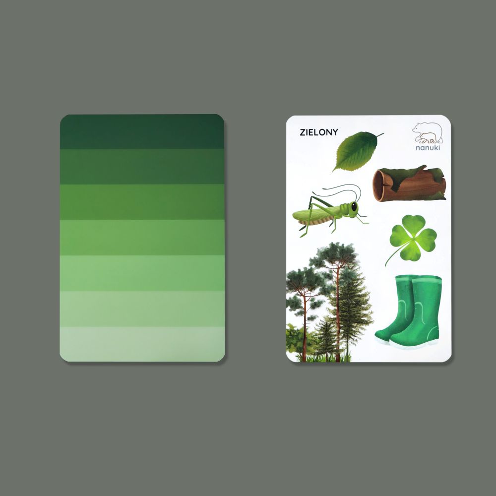 12 kart kolorów – na froncie odcienie danego koloru, a na odwrocie przedmioty w tym kolorze,