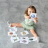 Karty są trwałe (papier 350 g/m², powlekane folią matową), mają bezpieczne, zaokrąglone rogi i format 10 × 15 cm. Do zestawu dołączony jest praktyczny bawełniany woreczek, dzięki któremu można zabrać karty na spacer, do przedszkola czy w podróż. Produkt posiada certyfikat CE.