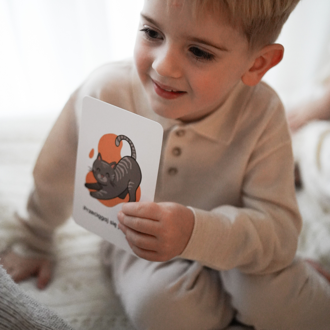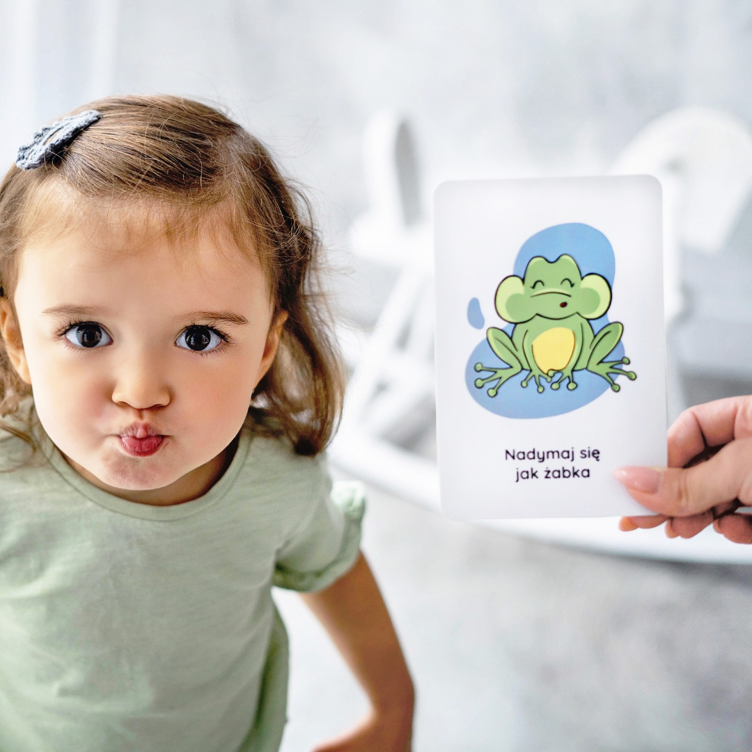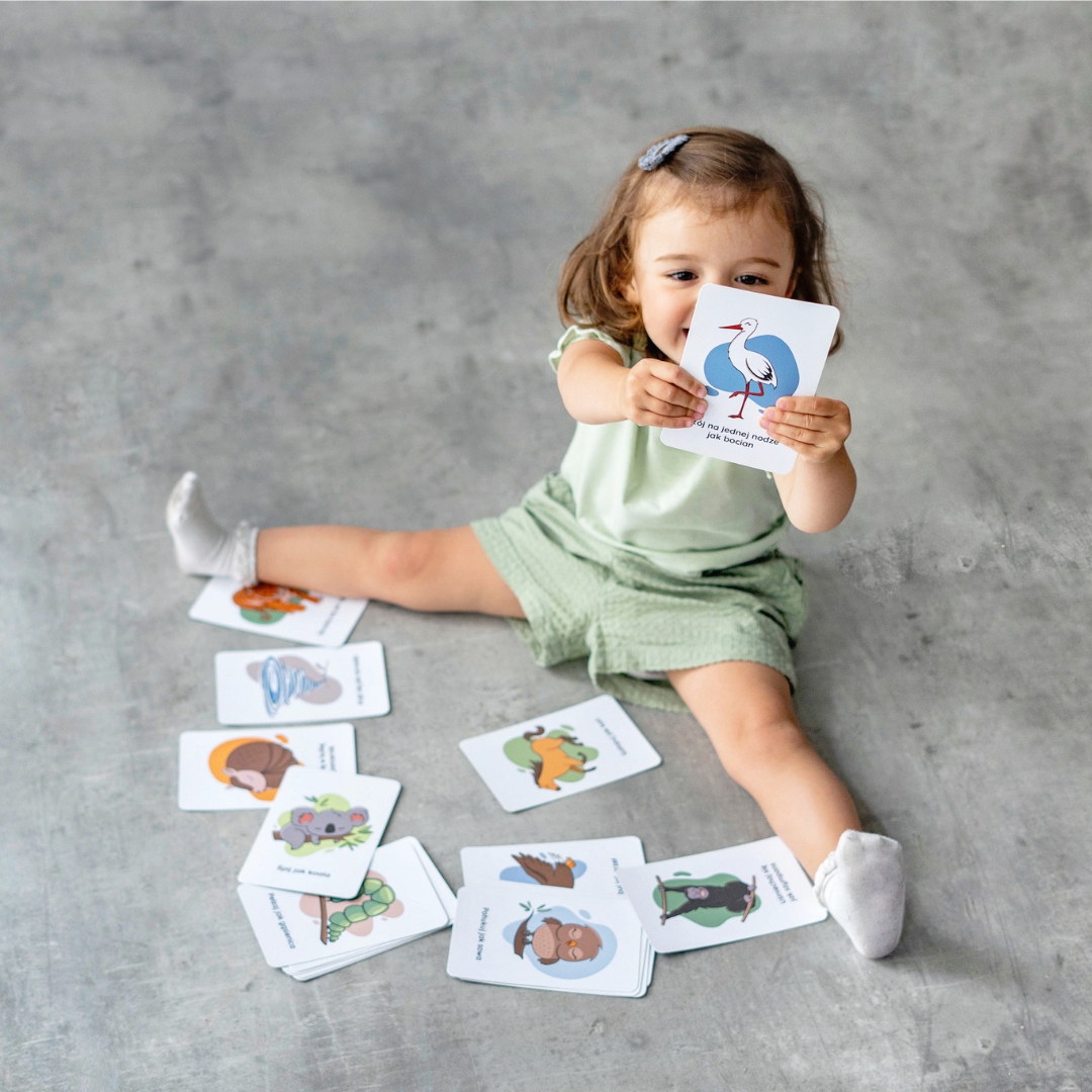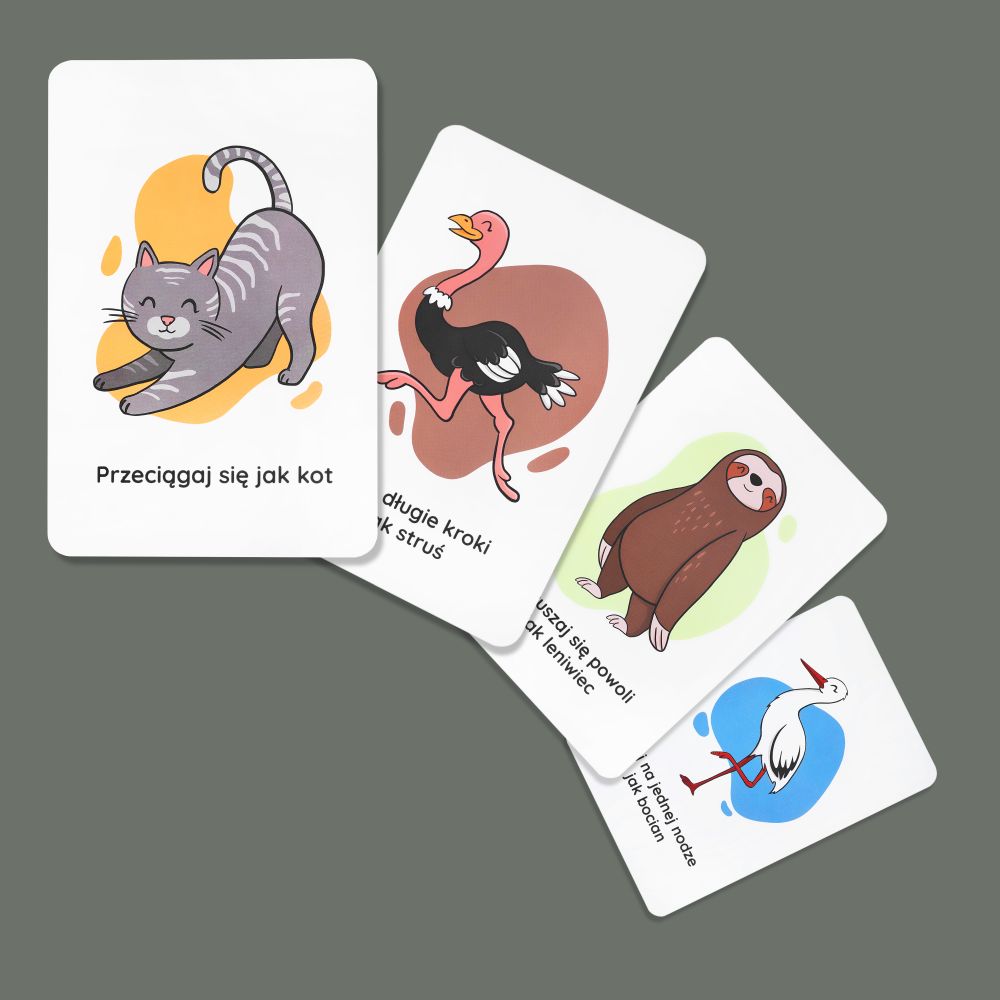 Zestaw zawiera 34 karty, z których każda ma zabawne polecenie, np. „kręć się jak tornado” czy „przeciągaj się jak kot”. Towarzyszą im autorskie ilustracje, które pobudzają wyobraźnię dzieci.