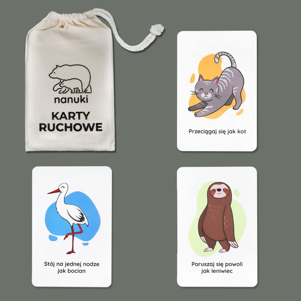 Karty Ruchowe NANUKI dla dzieci to połączenie nauki i zabawy. Wspierają rozwój fizyczny, pobudzają kreatywność i zachęcają do aktywności. To świetna okazja do spędzenia czasu razem – w domu, na spacerze czy w podróży.