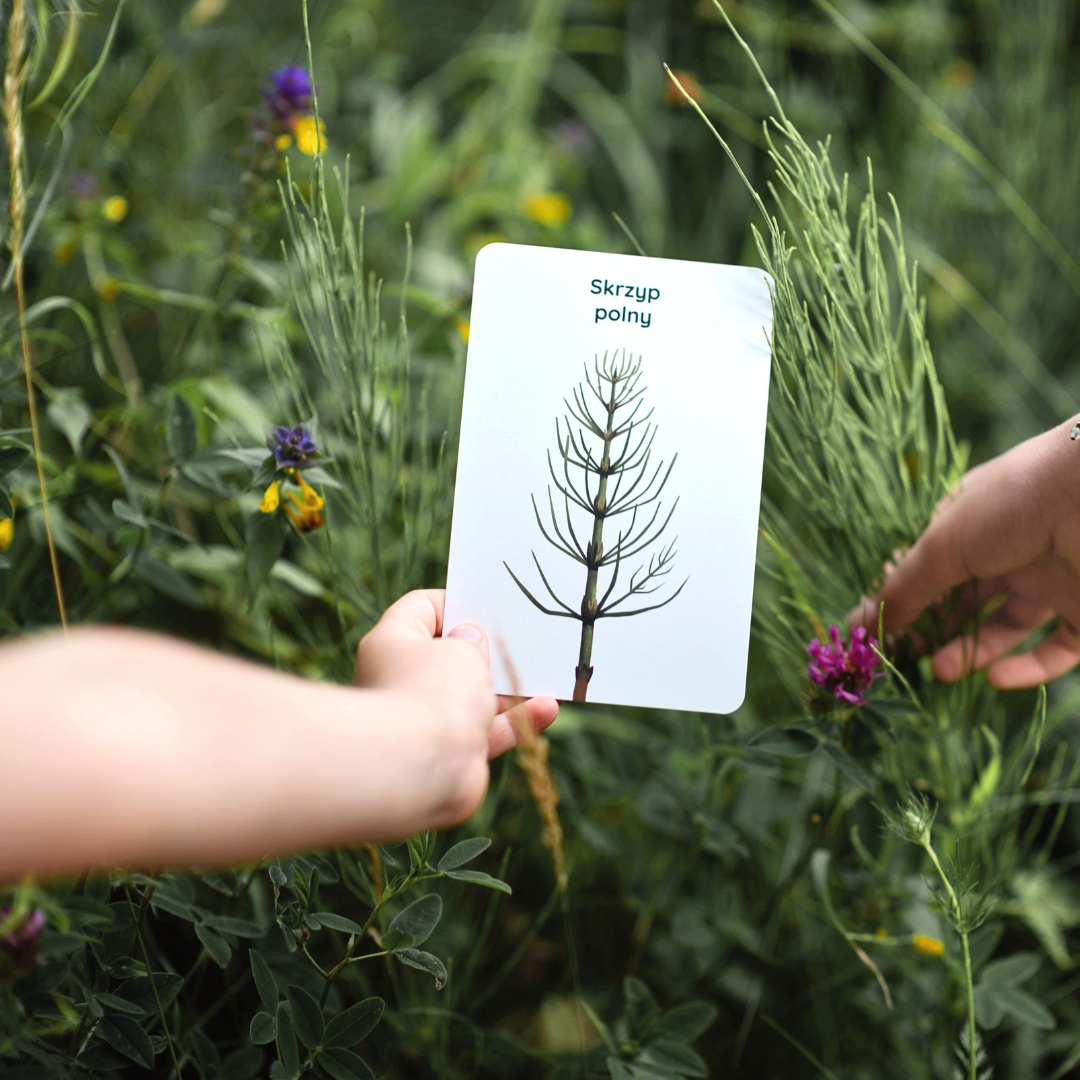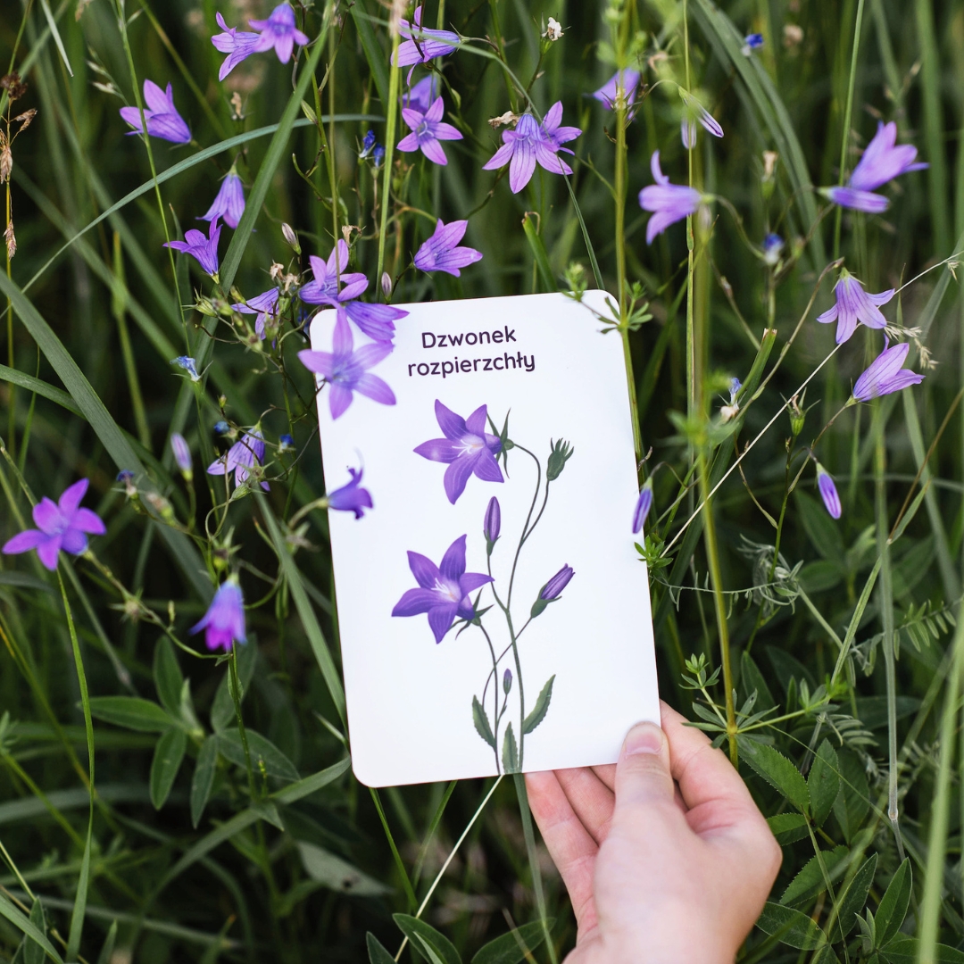 Zestaw zawiera 30 kart przedstawiających dziko rosnące kwiaty. Na jednej stronie każdej karty umieszczono nazwę rośliny oraz autorską ilustrację, która wiernie oddaje jej wygląd. Dzięki temu dzieci mogą łatwo rozpoznawać kwiaty podczas spaceru.