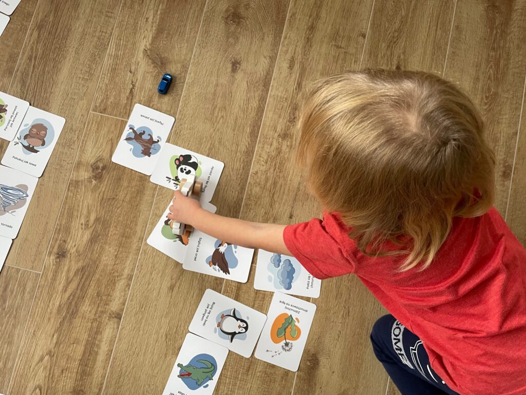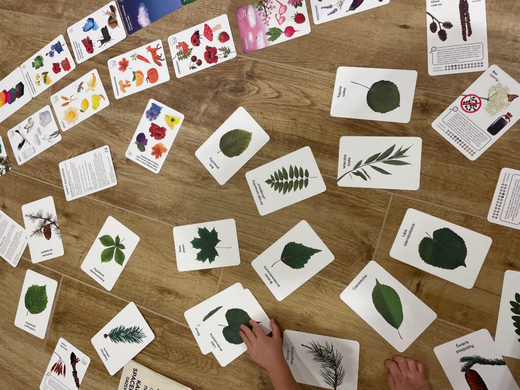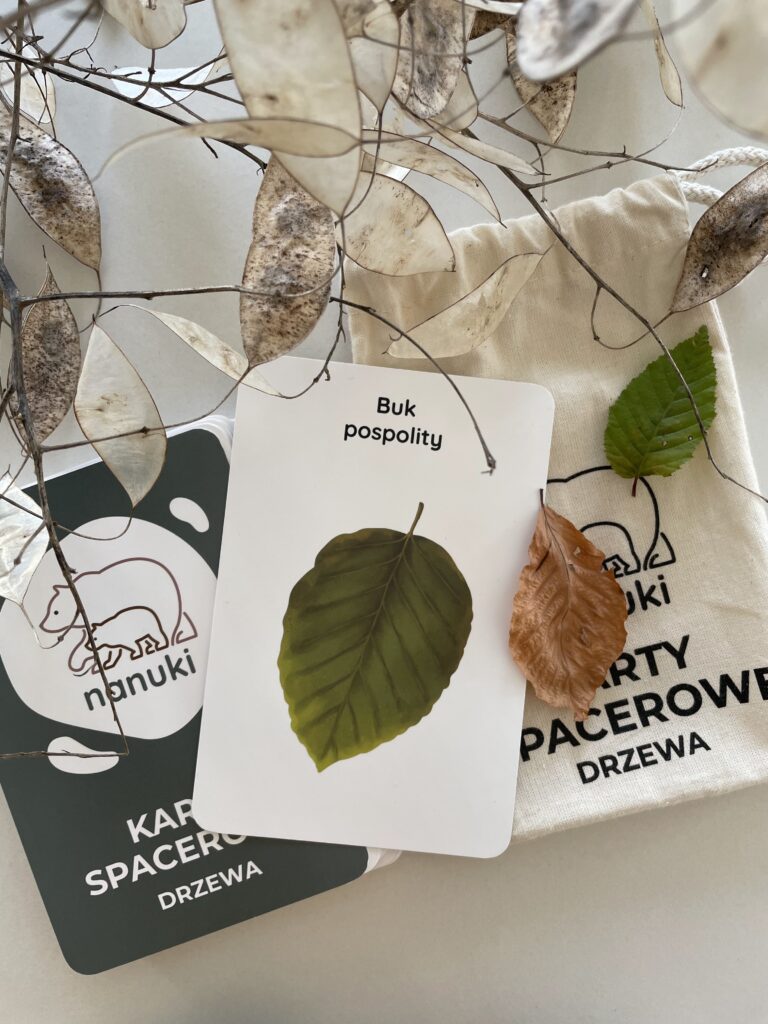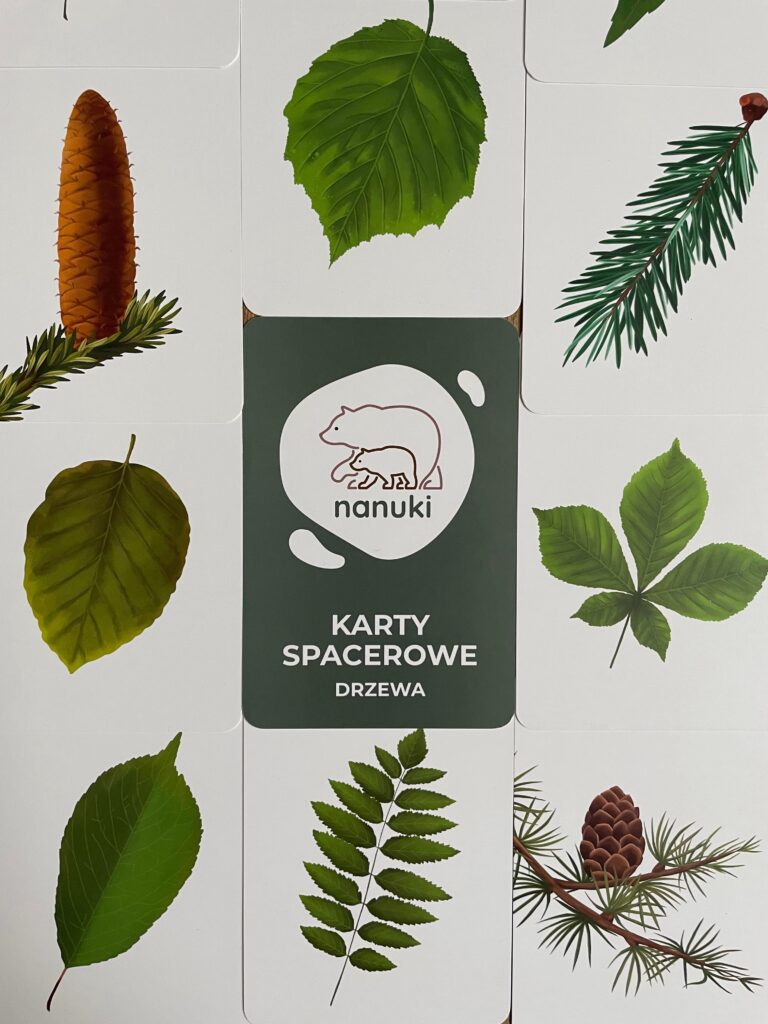 KARTY SPACEROWE NANUKI pozwalają na przeprowadzenie ciekawej lekcji przyrody albo zgadywanek związanych z drzewami. Możecie wylosować każdy po jednej karcie i narysować liście danego drzewa na kartce. Dodatkowo można użyć kolorów odpowiednich dla różnych pór roku, przy okazji omawiając miesiące przypadające na każdą z nich. Karty Spacerowe możecie też wykorzystać na poobiednim spacerze. Poćwiczycie spostrzegawczość, wyszukajcie i spróbujcie odróżnić jodłę od sosny czy świerk od modrzewia. W jednym z naszych wpisów wspominaliśmy również o doświadczeniu z obserwacją szyszki – to świetny pomysł na naukę przez zabawę!