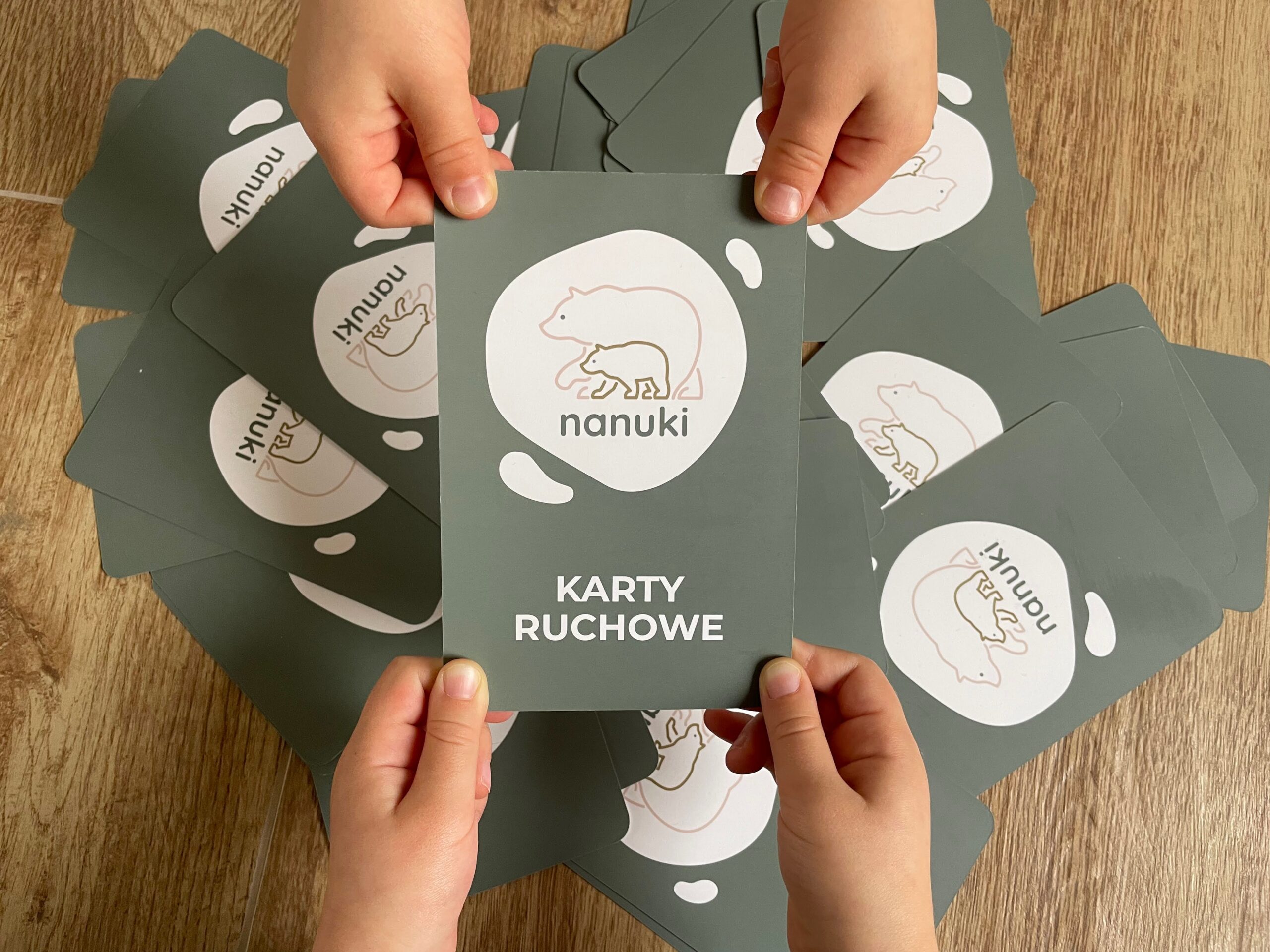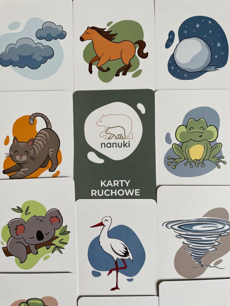 KARTY RUCHOWE NANUKI są idealnym rozwiązaniem, kiedy potrzebujecie spokojnie porozmawiać, wypić kawę czy przygotować obiad. Wystarczy położyć talię kart na stole lub podłodze, a dzieci będą odkrywać pojedyncze karty i wykonywać zadania. Młodsze dzieci mogą potrzebować pomocy z odczytaniem zadania, ale dla starszych to świetna okazja do ćwiczenia czytania. Gwarantujemy też, że z każdym kolejnym razem nasza pomoc będzie coraz mniej przydatna gdyż dzieci szybko kojarzą zadanie z atrakcyjnymi ilustracjami na kartach.