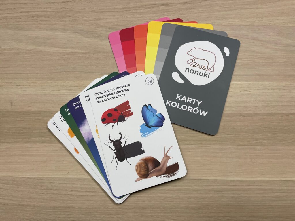 KARTY KOLORÓW NANUKI dają mnóstwo możliwości do zabawy, a dzieci mogą ćwiczyć przy nich swoją kreatywność i pomysłowość! Możecie porozkładać Karty na podłodze paletami barw do góry, a dzieci mają za zadania odszukać w domu przedmioty odpowiedniego koloru i układać dookoła danej karty. Możecie też wylosować lub wybrać jedną kartę koloru i odszukać przedmioty tego samego koloru, ale o innym odcieniu. W zestawie Kart Kolorów znajdziecie też gotowe pomysły na zabawy, więc gdy tylko zabraknie Wam pomysłów to możecie śmiało skorzystać z gotowca 🙂